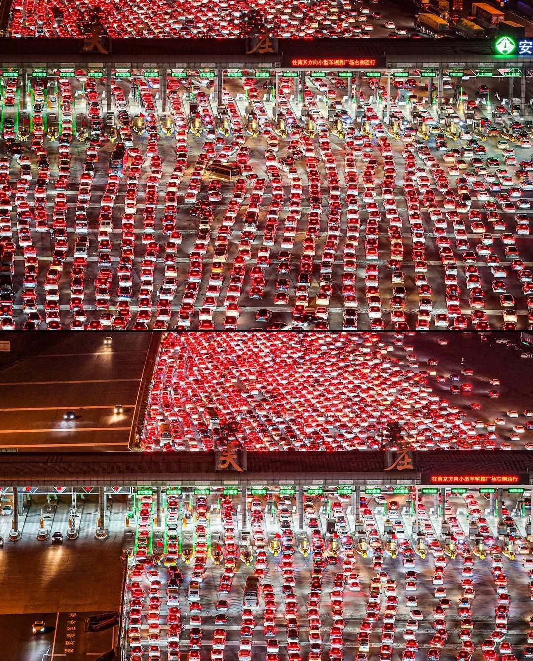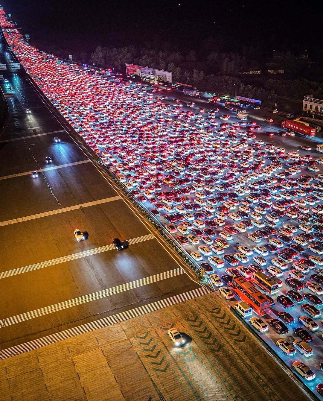 این پدیده بیشتر ناشی از سیاست معافیت از پرداخت عوارض در سیستم ۱۹۱۰۰۰ کیلومتری بزرگراه‌های کشور چین است؛ سیاستی که میلیون‌ها خودرو را از تعداد محدودی خروجی عبور می‌دهد و در نتیجه، بزرگراه‌های چین را به دریایی از چراغ‌های قرمز (نور ترمز) خودرو تبدیل می‌کند.