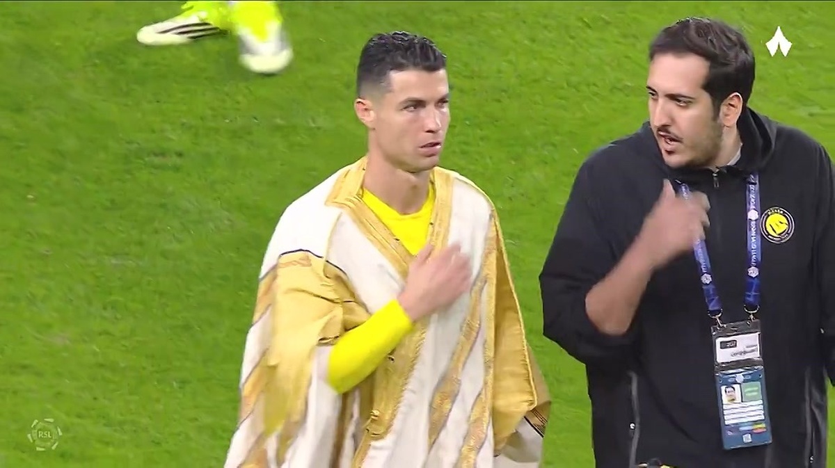فکرشهر: کریستیانو رونالدو بازیکن تیم النصر عربستان پس از پایان مسابقه تیمش با تیم الحزم، به مناسبت روز تاسیس عربستان، بشت (لباس عربی) به تن کرد.
